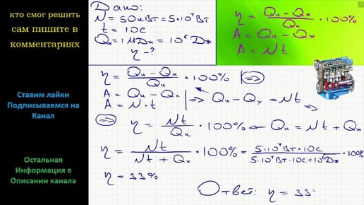 Физика Каков КПД теплового двигателя мощностью 50 кВт, если за 10 с он передал окружающей среде количество теплоты 1 МДж?