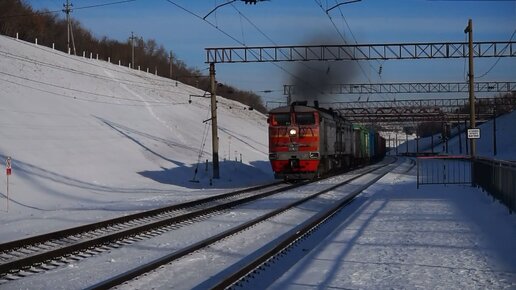 Тепловоз 2ТЭ10М-3434 шустро залетает на подъёме в мороз. Звук 10Д100.