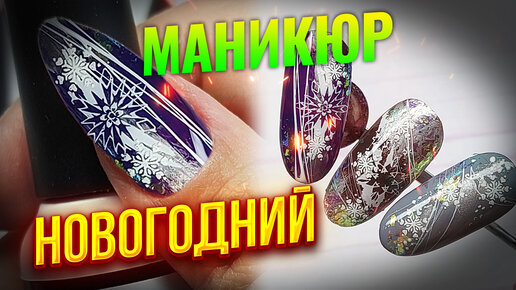 ❤️❤️❤️Идея новогоднего дизайна ногтей: Сочетание стемпинга и наклеек на синем гель-лаке с хлопьями юкки
