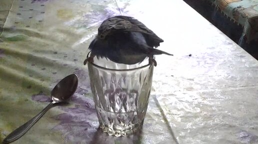 Кеша пьёт воду из стакана и играет с чайной ложкой_)