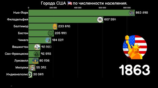 Топ 10 городов на территории США по численности населения. (1850-2021)