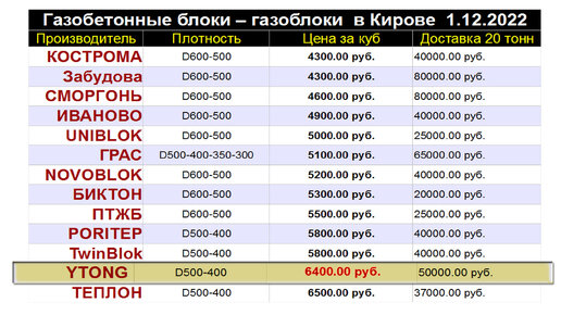Цены на газобетонные блоки в Кирове! 01.12.2022