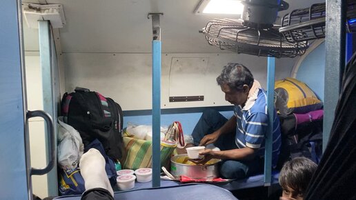 индус сел на свободную полку в поезде, чтобы разложить на продажу свою стряпню