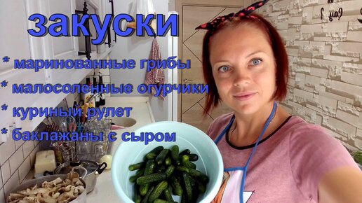 Закуски: маринованные грибы, малосоленые огурцы, куриный рулет, баклажаны с сыром