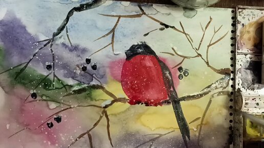 Акварель. Рисования. Зима. Снегирь. Творчество. Живопись.