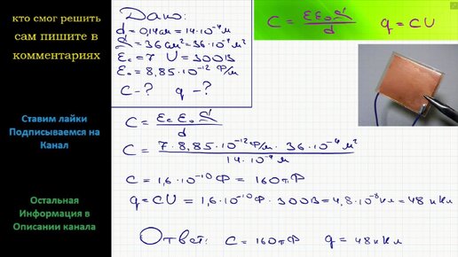 Физика Плоский конденсатор представляет собой слюдяную пластину толщиной 0,14 см и площадью 36 см2 на противоположные грани которой нанесены