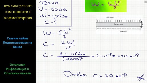Физика Определите электроемкость конденсатора, если при разности потенциалов на обкладках 1000 В энергия его электрического поля равна 10 Дж