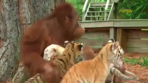 Самое милое что вы увидите на сегодня. Орангутанг играет с тигрятами.
