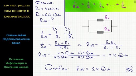 Физика Каково сопротивление участка цепи, состоящего из двух параллельно соединенных резисторов сопротивлениями 40 и 60 Ом?