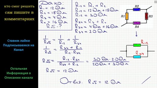 Физика Четыре резистора сопротивлениями R1 = 12 Ом, R2 = 18 Ом, R3 = 4 Ом и R4 = 16 Ом соединены по схеме изображенной на рисунке Определите