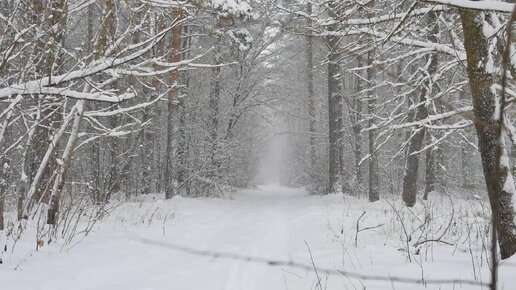 Прогулка в снежный зимний день. Идет снег на лесной дороге. Зимние пейзажи и зимние виды, фоновые звуки метели, и снегопада, белый шум.