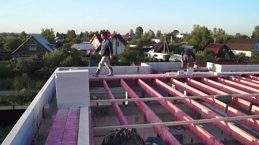 Дом с плоской крышей. Монтаж стропильной системы четырехскатной вальмовой крыши. Чердачное перекрытие по деревянным балкам