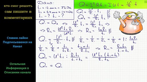 Физика Электрический чайник имеет две обмотки При включении одной из них вода закипает через t1 =12 мин при включении другой через t2 = 24