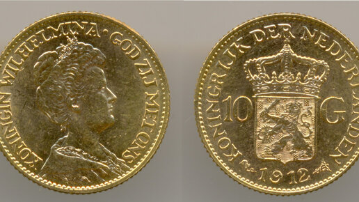 Нумизматика. Золотая монета. Нидерланды, 10 гульденов 1912 года. About Uncirculated.