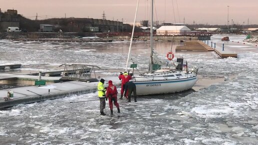 Вмерзшую в лед яхту выпиливают бензопилой. Долгий путь к причалу, так я бы это назвал.