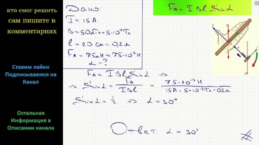 Физика Проводник, сила тока в котором равна 15 А, находится в однородном магнитном поле индукцией 50 мТл Какой угол образует с направлением