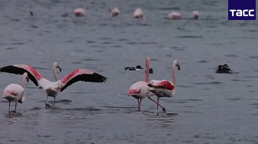 На южном Черноморье Болгарии на озера в районе города Бургас на зимовку прибыли розовые фламинго