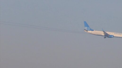 Самолет боинг-737, авиакомпании "Победа", заходит на посадку оставляя след в небе.