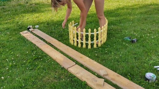 Далее: Уложила дорожку из тротуарной плитки вдоль забора на участок.