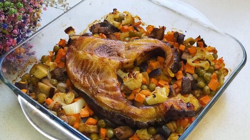 Даже не верится, что так просто. Стейк зубатки запеченный с овощами в духовке.