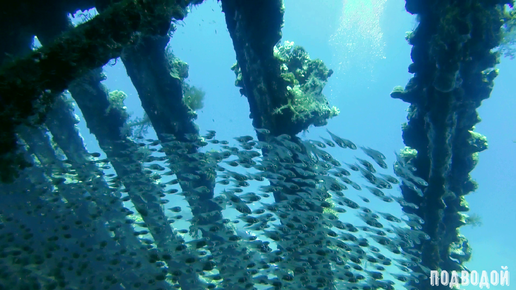 проплываем под разрушенной палубой кормовой части парусника, от палубы остались только опорные перекрытия обросшие кораллами.