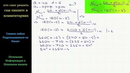 Математика Известно, что внутренние углы некоторого выпуклого многоугольника наименьший угол которого 120 образуют арифметическую прогрессию