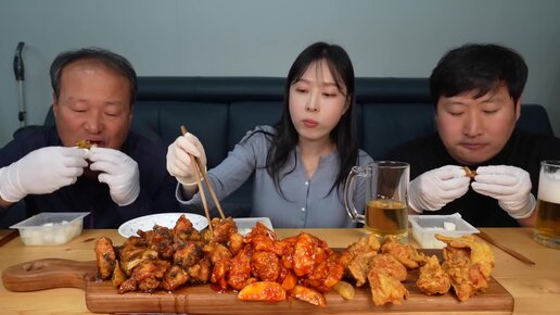 60 жареных и приправленных цыплят, 3 вида курицы с красным перцем и мукбанг с холодным пивом!!