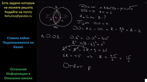 Математика В пересечение двух равных кругов вписан ромб с диагоналями 12 и 6 см. Найти радиус окружностей