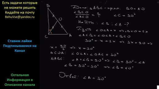Математика Определите острые углы прямоугольного треугольника если медиана проведенная к его гипотенузе делит прямой угол в соотношении 1/2