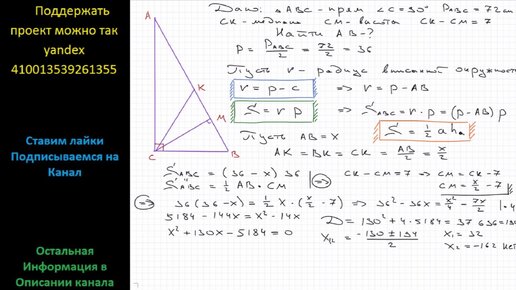Математика Периметр прямоугольного треугольника ABC (угол C = 90) равен 72 см, а разность между длинами медианы CM и высоты CK равна 7 см
