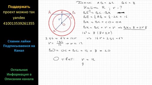 Математика В большем из двух концентрических кругов проведена хорда, равная 32 см и касающаяся меньшего круга Определить длину радиуса