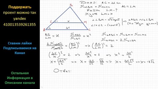 Математика Длина основания треугольника равна 36 см. Прямая, параллельная основанию, делит площадь треугольника пополам Найти длину отрезка
