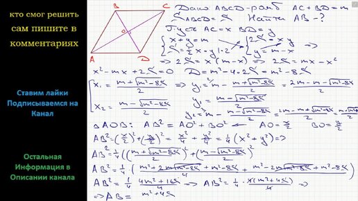 Математика Сумма длин диагоналей ромба равна m, а его площадь равна S. Найдите сторону ромба