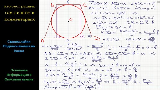 Математика Найдите площадь круга вписанного в равнобедренную трапецию если ее большее основание равно a а угол при меньшем основании равен