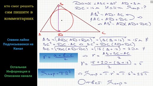 Математика Найти площадь круга вписанного в прямоугольный треугольник, если проекция катетов на гипотенузу равны 9 и 16 м