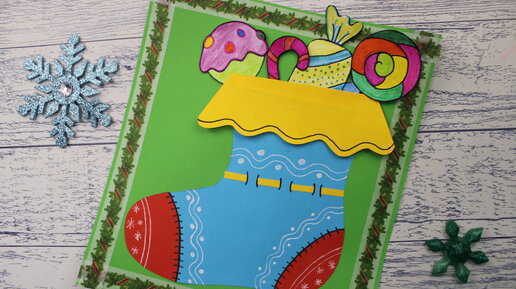 Новогодний НОСОЧЕК с конфетами🍭. Аппликация из бумаги.