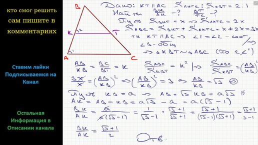 Математика Прямая, параллельная основанию треугольника, делит его на части, площади которых относятся как 2:1 В каком отношении, считая от