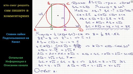 Математика Площадь равнобедренной трапеции, описанной около круга, равна 8 см2 Определить стороны трапеции если угол при основании содержит