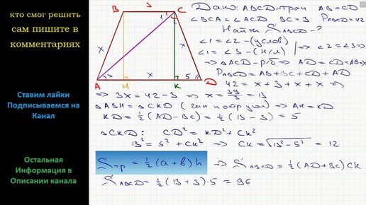 Математика Диагональ равнобедренной трапеции делит ее тупой угол пополам. Меньшее основание трапеции равно 3 см, периметр равен 42 см Найти