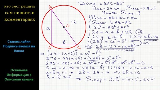 Математика Периметр прямоугольного треугольника равен 24 см, площадь его равна 24 см2. Найти площадь описанного круга