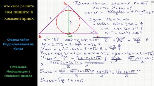 Математика Найти площадь равнобедренного треугольника с углом 120, если радиус вписанного круга равен ∜12 см