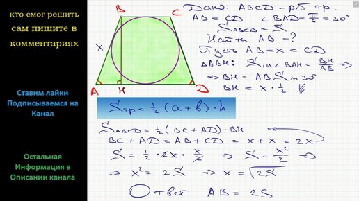 Математика Площадь равнобедренной трапеции, описанной около круга, равна S. Определить боковую сторону трапеции, если известно, что острый