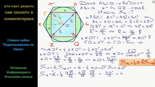 Математика Около квадрата, сторона которого равна a, описана окружность, а около окружности правильный шестиугольник. Определить площадь