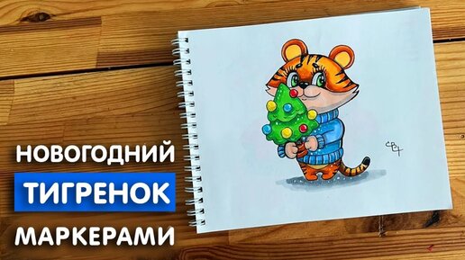 Рисунок скетч маркерами "Новогодний тигренок" для скетчбука | Срисовка картинки для начинающих