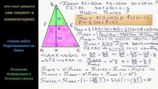 Математика Основание треугольника равно 30 см, а боковые стороны равны 26 и 28 см. Высота разделена в отношении 2:3 (считая от вершины)