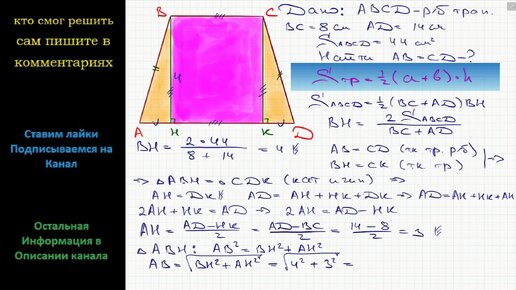 Математика Определить боковые стороны равнобедренной трапеции, если ее основания равны 8 и 14 см, а площадь равна 44 см2