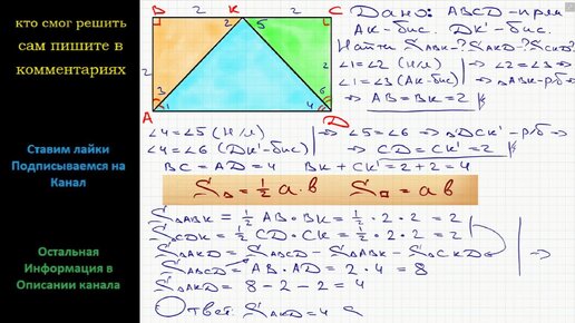 Математика В прямоугольнике проведены биссектрисы двух углов, прилежащих к большей стороне. На какие части делится площадь прямоугольника