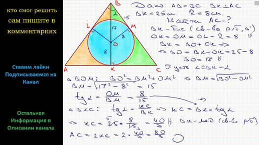 Математика Длина высоты, проведенной к основанию равнобедренного треугольника, равна 25 см, а радиус вписанной окружности равен 8 см Найти