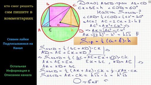Математика Найти площадь равнобедренной трапеции, если ее высота равна h а боковая сторона видна из центра описанной окружности под углом 60