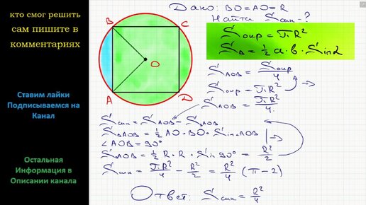 Математика Круг, радиус которого равен R, разделен на два сегмента хордой равной стороне вписанного квадрата. Определить площадь меньшего
